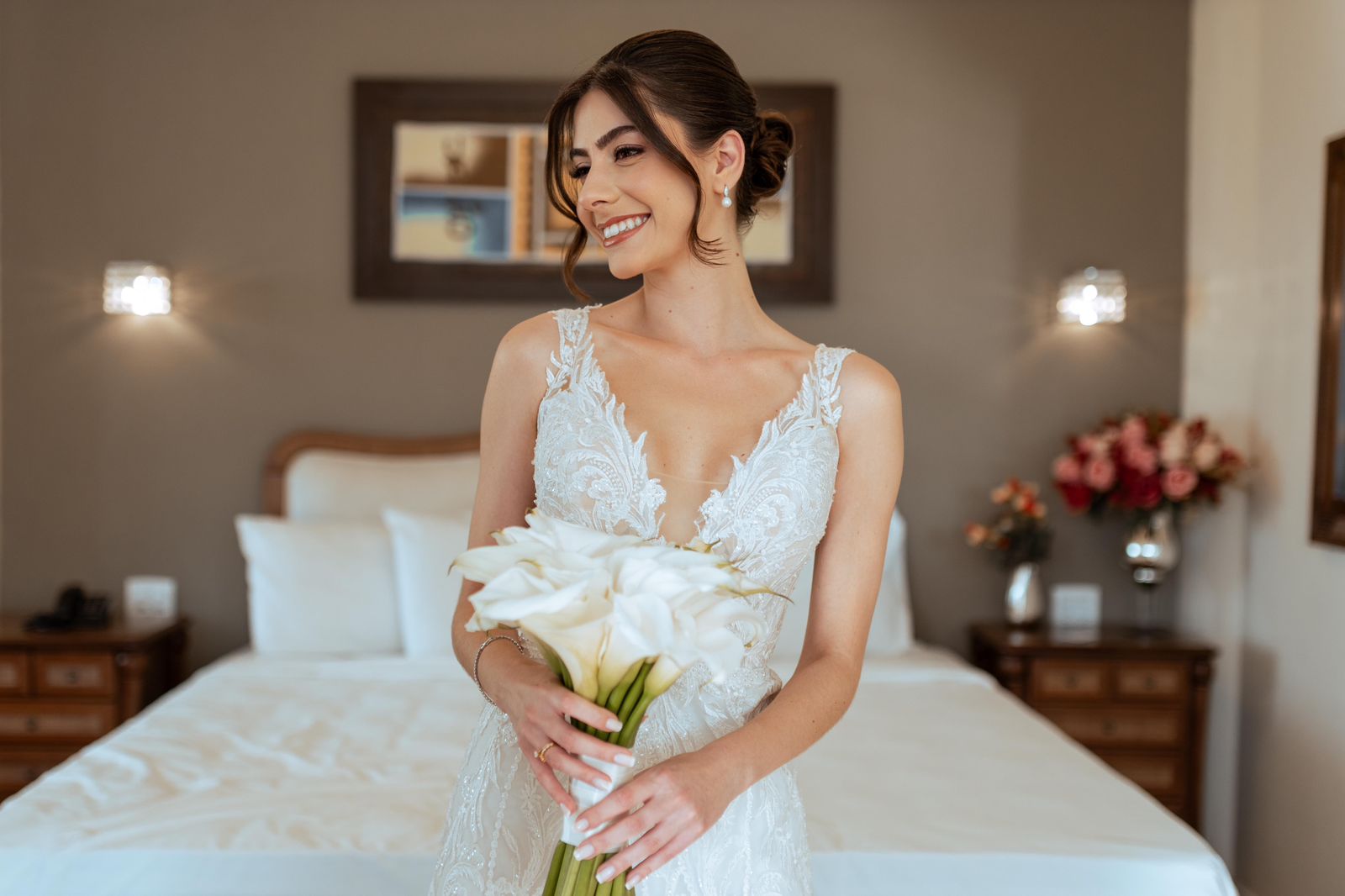 Quarto elegante do hotel Noiva se preparando no hotel