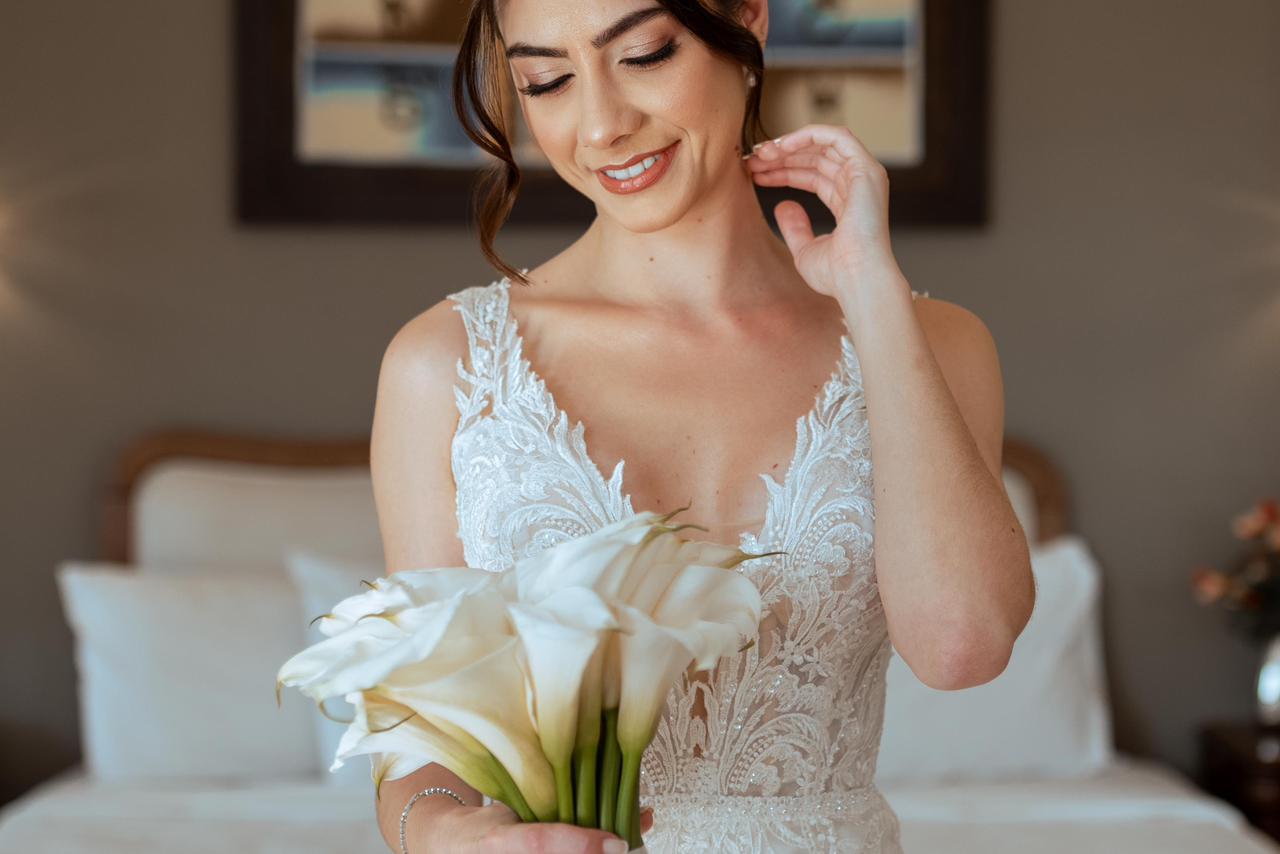 Um mês antes do casamento, realizamos um alinhamento detalhado sobre seu estilo, referências, vestido, personalidade e proposta do evento.